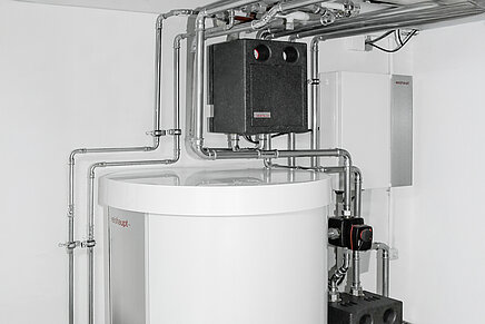 Za skladištenje tople vode za ovu zgradu su odabrani bafer rezervoar od 300 litara i rezervoar za toplu vodu zapremine 300 litara. Kontrolna i radna jedinica za toplotnu pumpu je montirana na zid.